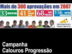 As mais de 300 aprovações no Vestibular 2007 estão expostas nas ruas, nas diversas placas publicitárias em pontos estratégicos de Taubaté e Pindamonhangaba que confirmam, com números reais, a liderança do Colégio e Curso Progressão em aprovações em Taubaté e região.