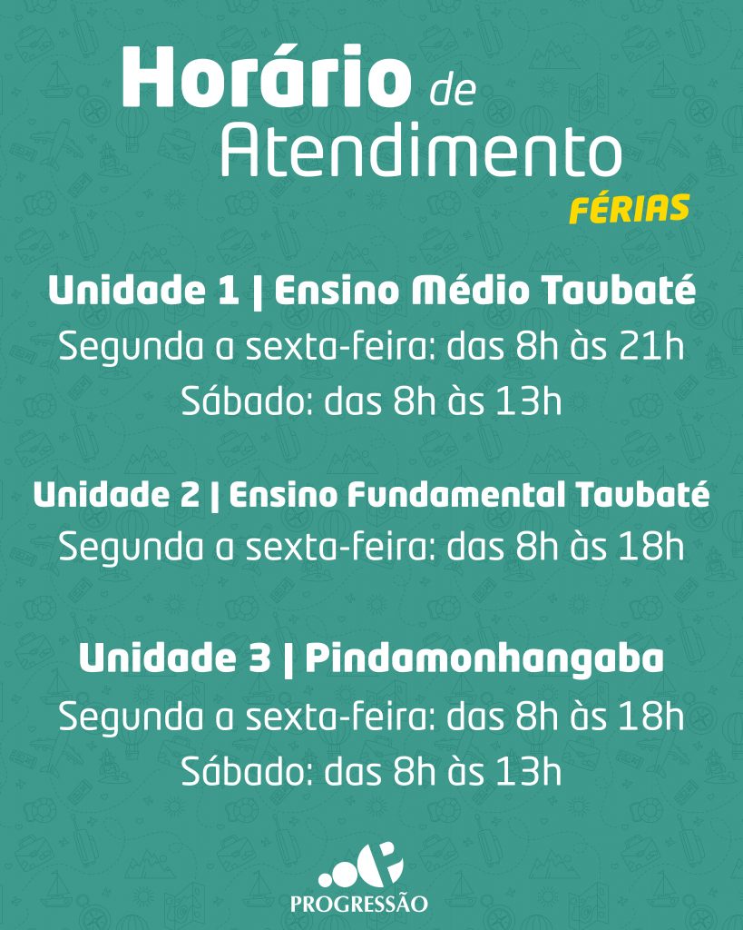 Durante o período de férias as unidades do Colégio Progressão atenderão em horário diferenciado. Unidade 1 – Ensino Médio Taubaté Segunda a sexta-feira: das 8h às 21h Sábado: das 8h às 13h Unidade 2 – Ensino Fundamental Taubaté Segunda a sexta-feira: das 8h às 18h Unidade 3 – Pindamonhangaba Segunda a sexta-feira: das 8h às […]