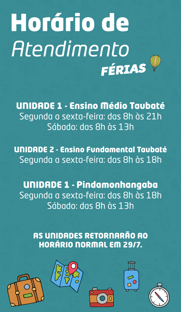Fiquem ligados ao horário de atendimento das Unidades do Colégio Progressão durante as férias! UNIDADE 1 – Ensino Médio Taubaté Telefone: (12) 3621-6030. Unidade 2 – Ensino Fundamental Taubaté Telefone: (12) 3622-3033 Unidade 3 – Pindamonhangaba Telefone: (12) 3648-2658