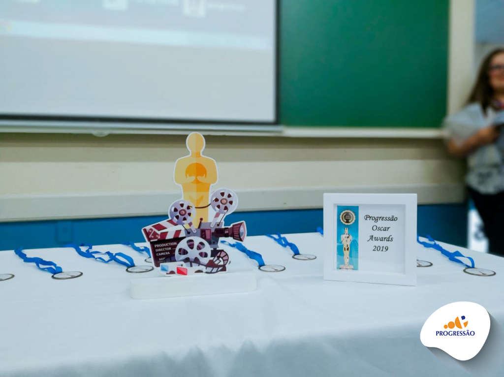 PROGRESSÃO OSCAR AWARDS – 2019 A professora Paola Echeverria do Programa High School propôs aos alunos que fizessem filmes e os roteiros deveriam ser produzidos e gravados em inglês. Os alunos finalistas receberam um prêmio no dia do Progressão Oscar Awards! Confira as fotos: