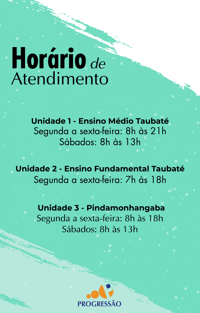 As unidades do Colégio Progressão estão funcionando em horários diferentes durante as férias de julho. Fique atento para ser melhor atendido. Unidade 1 – Ensino Médio Taubaté | (12) 3621-6030 Unidade 2 – Ensino Fundamental Taubaté | (12) 3622-3033 Unidade 3 – Pindamonhangaba | (12) 3648-2658